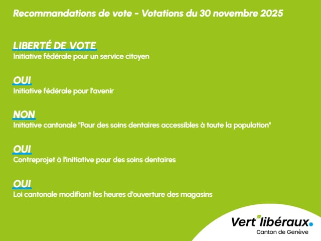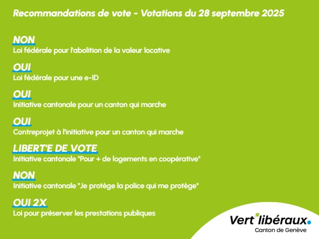 Le Parti vert’libéral (PVL) genevois a tenu deux assemblées générales les 23 et 24 septembre afin de déterminer les recommandations de vote pour les votations cantonales et fédérales du 24 novembre prochain.