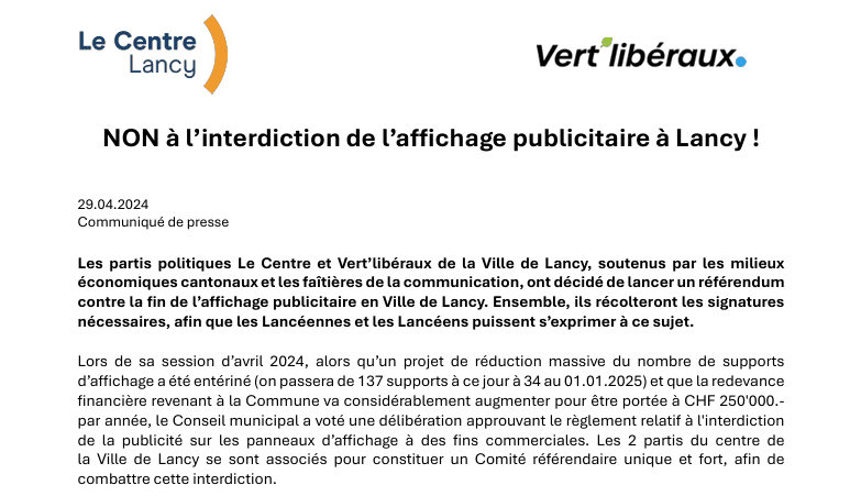 Lors de sa session d’avril 2024, alors qu’un projet de réduction massive du nombre de supports d’a;ichage a été entériné (on passera de 137 supports à ce jour à 34 au 01.01.2025) et que la redevance financière revenant à la Commune va considérablement augmenter pour être portée à CHF 250’000.- par année, le Conseil municipal a voté une délibération approuvant le règlement relatif à l’interdiction de la publicité sur les panneaux d’a;ichage à des fins commerciales. Les 2 partis du centre de la Ville de Lancy se sont associés pour constituer un Comité référendaire unique et fort, afin de combattre cette interdiction.